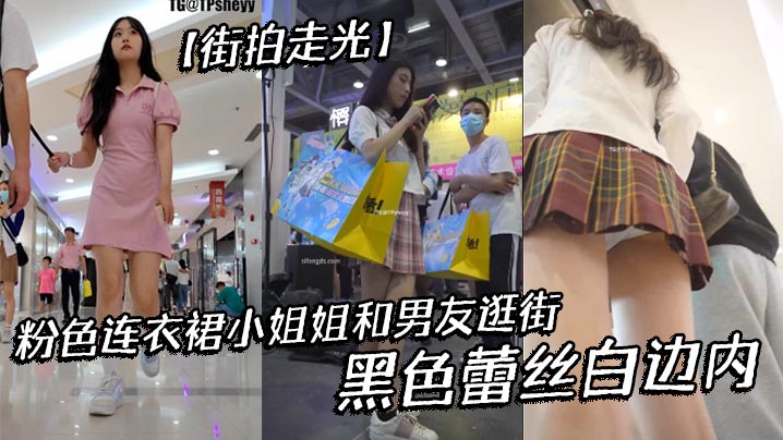 【街拍走光】粉色连衣裙小姐姐和男友逛街,黑色蕾丝白边内
