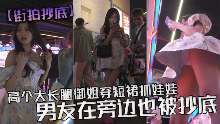 【街拍抄底】高个大长腿御姐穿短裙抓娃娃,男友在旁边也被抄底,白色透明内内,从前面抄底能看见y毛